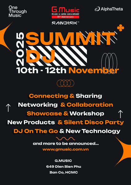Diễn ra từ ngày 10 – 12 tháng 11 năm 2025 tại G.Music, 649 Điện Biên Phủ, Phường Bàn Cờ, TP Hồ Chí Minh. Đây không chỉ là một sự kiện trưng bày sản phẩm - SUMMIT DJ là nơi kết nối cộng đồng DJ, nhà sản xuất âm nhạc và người yêu công nghệ trình diễn tại Việt Nam, với mục tiêu lan tỏa kiến thức, truyền cảm hứng sáng tạo và thúc đẩy phát triển bền vững cho cộng đồng DJ tại Việt Nam.