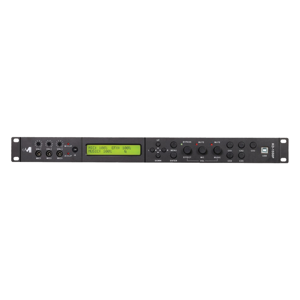 | Front Panel | 2x24 character LCD display with Blue LED backlight 4 x RED LED: MIC Clip, MIC Mute, Music Clip, Music Mute 1 x Green LED: Effect bypass 11 x Push Button switch: UP, DOWN, L, R, MENU, ENTER, CH1 to CH5 2 x pontentiometer for MIC Volume control 3 x TRS Jack MIC input Infrared remote control receiver Type B USB Connector |